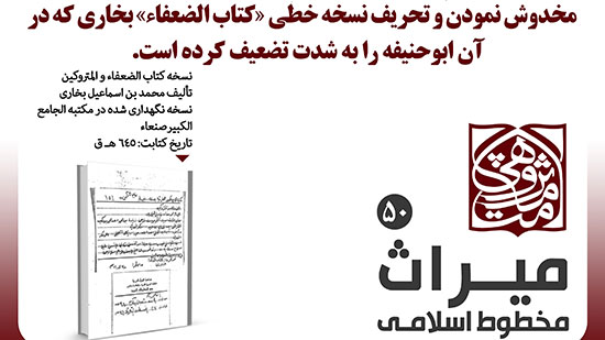 مخدوش نمودن و تحریف نسخه خطی «کتاب الضعفاء» انتشار: ۲۸ فروردین, ۱۳۹۸ بدون دیدگاه بازدید: 13 اشتراک گذاری مخدوش نمودن و تحریف نسخه خطی «کتاب الضعفاء» بخاری که در آن ابوحنیفه را به شدت تضعیف کرده است.مشخصات نسخهکتاب «الضعفاء و المتروکین» تألیف محمد بن اسماعیل بخارینسخه نگهداری شده در مکتبه جامعه الکبیر ـ صنعاءتاریخ کتابت: 645 هـ قدسته: دست نوشته ها, فیش های تصویری, میراث مخطوط اسلامی قبلیقبلیبی وفائی امّت بعدیحدیث غدیر یقینی استبعدی