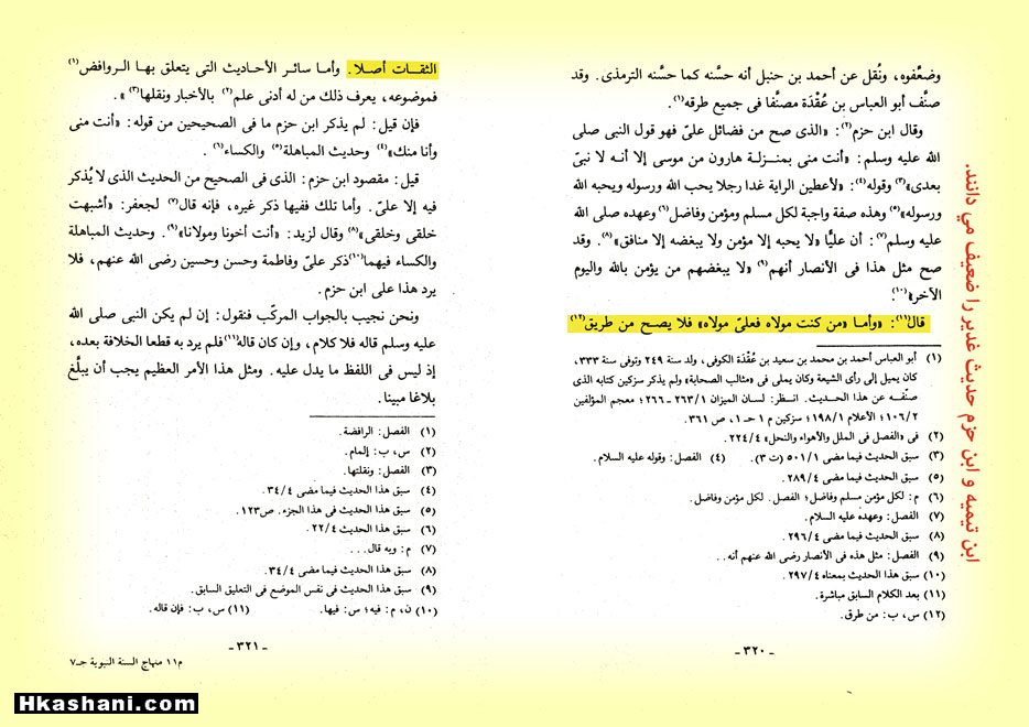 می گوید: بله! آیا ابن العربی تنهایی این حرف را زده است؟ نخیر. ابن تیمیه هم این حرفها را گفته است. ابن تیمیة در جلد هفت کتاب منهاج السنة صفحه 321 می گوید: ابن حزم گفته است: از فضائل علی سه روایت صحیح است اما من کنت مولاه فعلی مولاه فلا یصح من طریق الثقاة أصلا