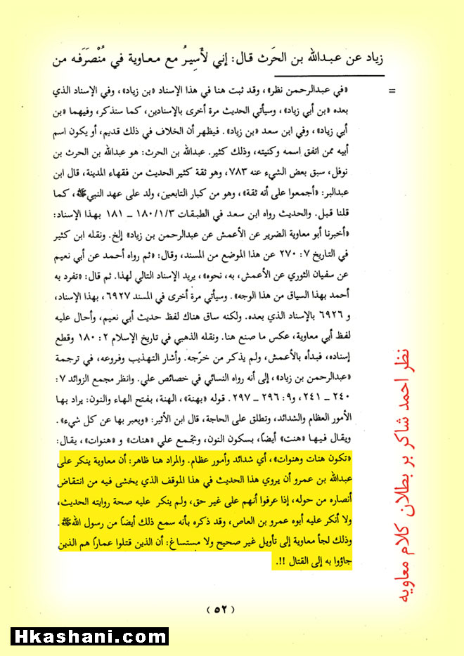 معاویه دو خطا کرد دربرابر روشن گری رسول خدا . هم با امیرالمومنین جنگید که رسول خدا فرمود این کار ظلم است ، بغی است ، دعوت به آتش است و معاویه امام دعوت به آتش است. روایت متواتر را که شنید به گونه ای که ابن تیمیه گفت بچه هم می فهمد این کار خطاست ؛ بازی کرد تا از محتوای روایت فرار کنند. این کلام ما نیست ؛ احمد شاکر ، محقق کتاب مسند احمد حنبل می گوید : معاویه وقتی هیچ راهی برای فرار نداشت و دید اگر این روشن شود و سپاهش می فهمد چه کسی حق است و چه کسی باطل و معاویه مجبور است از امیرالمومنین تبعیت کند ، پناه برد به این تعبیر باطل. شعیب ارنعوت ، وهابی معاصر می گوید که این مغالطه است؛ هذه مغالطۀ من معاویۀ. یعنی معاویه می دانست که دارد خطا می کند. اگر شما اینگونه می گویید باید بگویید که من لم یحکم بما انزل الله فاولئک هم الکافرون ؛ روایت نبوی ، نص قرآنی هست که رسول خدا از هوای نفس حرف نمی زند ، اینجا شما باید معاویه را تکفیر کنید منتهی متاسفانه می بینیم دفاع از معاویه تمامی ندارد؛ قرطبی قد علم می کند؛ در شرح صحیح مسلم جلد هفت ص 258 می گوید: حاش معاویه عن مثل هذا التعبیر . نخیر معاویه نگفته پناه بر خدا اگر معاویه گفته باشد بلکه از معاویه نقل شده که او گفته قاتل عمار جهنم هم خواهد رفت. باز می گوییم که آقای قرطبی و امثال آقای قرطبی که تفکر اموی دارند ، جلسات پیش دوستان یادشان هست ما سند صحیح پناه بردن معاویه به این که ما نکشتیم ، بلکه علی عمار را آورد و او را کشت ، با هم بحث کردیم. سندهای متعدد خواندیم. به جای اینکه شما بگویید پناه بر خدا که معاویه چنین خطایی کرده بگویید پناه بر خدا از اینکه در برابر روایت متواتر نبوی انسان دست به توجیهات بچه گانه دست بزند.