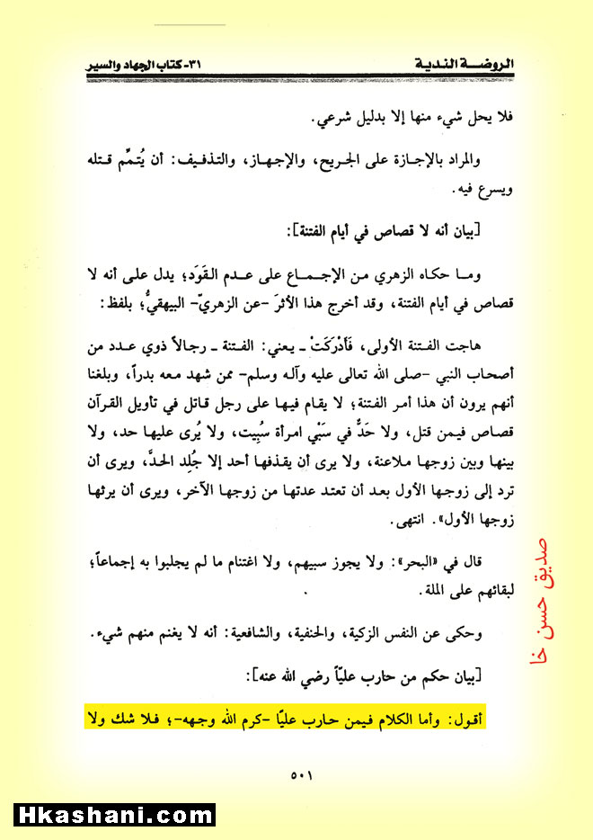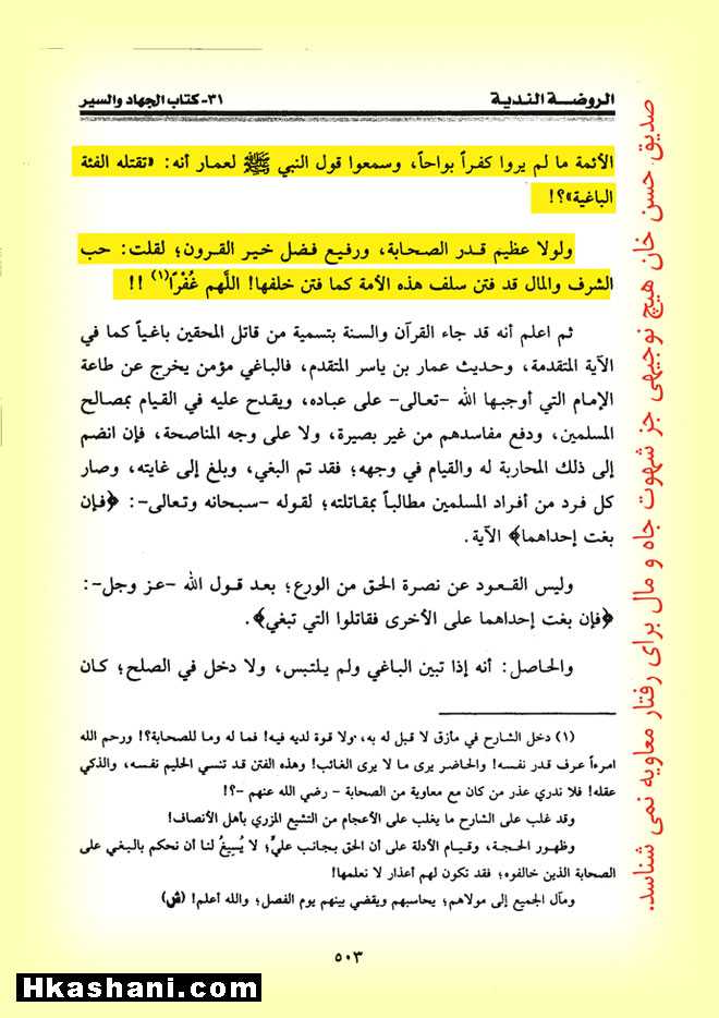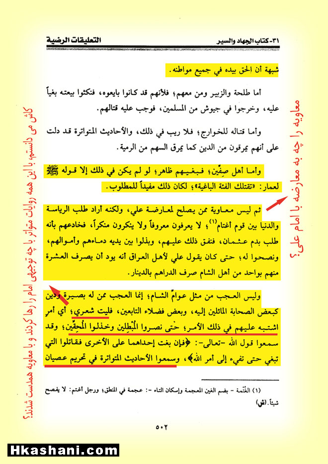 همه ی ادعای ما چه بود؟ دو سه درصد از سلفی گری هستند که اموی فکر می کنند. دو سه درصد از بزرگان اهل سنت هم تحت تاثیر اینها هستند. عموم جهان اسلام در مورد معاویه مثل شیعه فکر می کنند. شیعه و سنی اختلاف دارند اما نه در این حد که معاویه را عادل بدانند. نمونه اش عالم برجسته، فحل الفحول هندوستان ، صدیق حسن خان ؛ عالم برجسته ی کثیرالتالیف است. او وقتی روایت ویح عمار را می بیند؛ در کتاب روضۀ الندیۀ که البانی معروف هم به آن تعلیقه زده است ؛ شروع می کند به پاسخ دادن. اول می گوید: اما الکلام فی من حارب علیا اما در باره کسی که با علی جنگیدند فلا شک و لا شبهۀ نه شکی است و نه شبهه ای ان الحق بیده فی جمیع مواطن همه جا حق با علی بود. می گوید حتی طلحه و زبیر هم بغی کردند. اما اهل صفین فبغیهم ظاهر . اهل صفین که دیگر روشن است. روایت ویح عمار متواتر است؛ اصلا کسی نمی تواند با او در بیفتد. ببینید او هم یک سنی است ولی در برابر واضحات نمی آید عناد بورزد. بعد یک عبارت می گوید: می گوید معاویه اصلا صلاحیتی نداشت تا با علی درگیر شود؛ منتها معاویه چون ریاست طلب و دنیا پرست بود ، خادعهم ؛ بیچاره های اهل شام را که پیامبر را ندیده بودند را گول زد. به چه؟ به دَم عثمان.گفت بروید دنبال خون عثمان.بعد معاویه نفاق ورزید. بعد می گوید من تعجب از عوام اهل شام ندارم ؛ تعجم از کسانی است که می گویند ما صحابه ایم مثل عمروعاص.