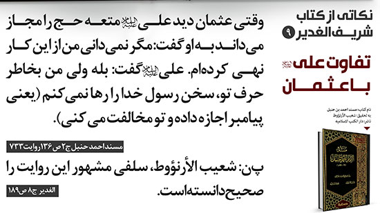 وقتی عثمان دید علـی علیه السلاممتعـه حـج را مجـاز میدانـد بـه او گفت: مگر نمیدانی من از این کـار نهـی کردهام. علی علیه السلام گفت: بله ولی من بخاطر حرف تو، سخن رسول خدا را رها نمیکنم (یعنی پیامبر اجازه داده و تو مخالفت می کنی). «مسند احمد حنبل ج۲ ص ۱۳۶روایت۷۳۳»