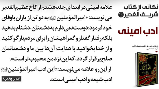 علامه امینی در ابتدای جلد هشتم از کاخ عظیم الغدیر می نویسد: «امیرالمؤمنین علیه السلام به دو تن از یاران باوفای خود فرمود: دوست نمیدارم به دشمنان، دشنام بدهید بلکه رفتار گفتار و گمراهیشان را برای مردم بازگو کنید و از خدا بخواهید با هدایت آنها بین ما و دشمنانمان صلح برقرار گردد، که این نزد من محبوبتر است». از اینرو علامه مینویسد:« این ادب امیرالمؤمنین علیه السلامادب شیعه و ادب امینی است.»