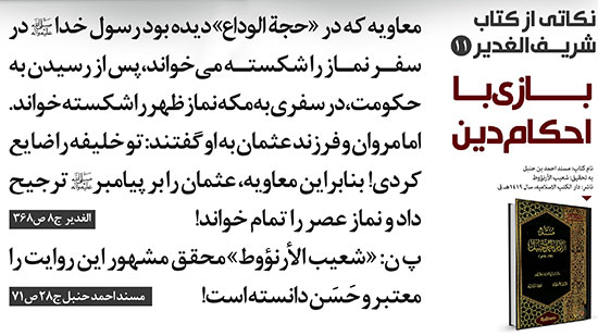 معاویه که در «حجه الوداع» دیده بود رسول خدا صلی الله علیه و آله و سلمدر سفـر نمـاز را شکستـه میخواند،پس از رسیدن به حکومت، در سفری بهمکه نماز ظهر را شکسته خواند. اما مروان و فرزند عثمان به او گفتند: تو خلیفه را ضایع کردی! بنابراین معاویه، عثمان را بر پیامبرصلی الله علیه و آله و سلم ترجیح داد و نماز عصر را تمام خواند!