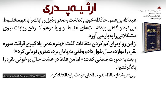 عبدالله بن عمر، حافظه خوبی نداشت و صدر و ذیل روایات را با هم مخلـوط میکرد و گاهی برداشـتهای غلـط او و یا درهم کـردن روایات نبوی مشکلاتی را به بار می آورد. از این رو او برای کم کردن انتقادات گفت: «پدرم عمر، یادگیری قرائت سوره بقره را دوازده سال طول داد و وقتی به پایان برد، شتری قربانی کرد»! و بعد به صورت ضمنی گفت: « اما من فقط در هشت سال روخوانی بقره را یاد گرفتم.»