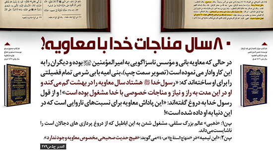 در حالی که معاویه بانی و مؤسس ناسزاگویی به امیرالمؤمنین علیه السلام بوده و دیگران را به این کار وادار می نموده است (تصویر سمت چپ)، بني اميه با بي شرمي تمام فضيلتي را براي او ساختهاند که: « رسولخدا صلی الله علیه و آله و سلم هشتاد سال معاویه را در بهشت گم میکند و او در این مدت به راز و نیاز و مناجات خصوصی با خدا مشغول بوده است» ! و از قول رسول خدا به دروغ گفتهاند: « این پاداش معاویه برای نسبتهای ناروایی است که در این دنیا به او داده شده است»!