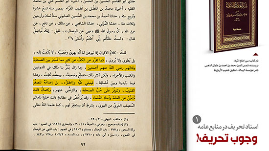 «ذهبی» عالم برجسته اهل سنت در مورد وجوب کتمان و از بین بردن اسناد «اختلاف بین اصحاب» با صراحت در کتاب سیر اعلام النبلاء ج 10 ص 92 می گوید: برای اینکه دلها با صحابه پاک شود، اگر به یک مشاجره بین صحابه رسیدی، واجب است که آن موضوع را مخفی کنی، نه تنها مخفی، که نابود کنی! و بر آحاد علما و مردم واجب است که آن مطلب را کتمان کنند.