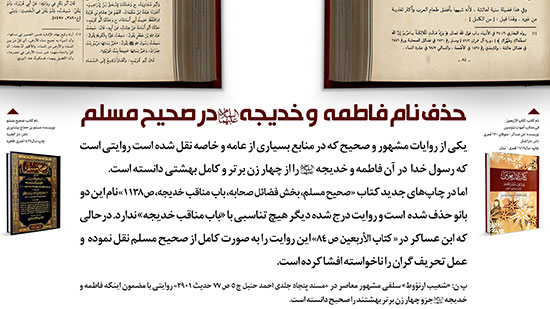 اما در چاپهای جدید کتاب «صحیح مسلم، بخش فضائل صحابه، باب مناقب خدیجه، ص 1138» نام این دو بانو حذف شده است و روایت درج شده دیگر هیچ تناسبی با «باب مناقب خدیجه» ندارد. درحالی که ابن عساکر در« کتاب الأربعین ص 84» این روایت را به صورت کامل از صحیح مسلم نقل نموده و عمل تحریف گران را ناخواسته افشا کرده است.