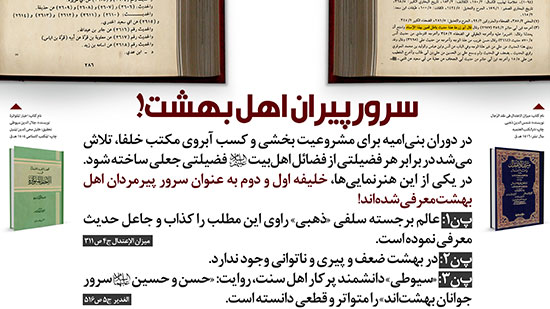در دوران بنیامیه برای مشروعیت بخشی و کسب آبروی مکتب خلفا، تلاش میشد در برابر هر فضیلتی از فضائل اهلبیت علیهم السلام فضیلتی جعلی ساخته شود. در یکی از این هنرنماییها، خلیفه اول و دوم به عنوان سرور پیرمردان اهل بهشت معرفی شدهاند!
