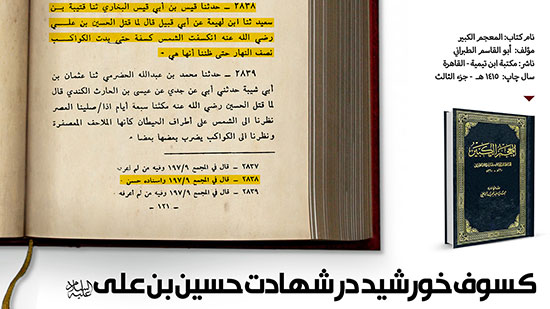 کسوف خورشید در شهادت حسین بن علی علیه السلام انتشار: ۴ آبان, ۱۳۹۵ بدون دیدگاه بازدید: 13 اشتراک گذاری در آن روز هنگامی که حسین بن علی علیه السلام به قتل رسید، به گونه ای خورشید گرفت که آسمان تاریک شد و در وسط روز ستارگان نمایان شدند!!پ ن: محقق کتاب سند روایت را حسن و معتبر می داند.برگرفته از کتاب المعجم الکبیر ج 3 ص 121دسته: گرافیک, نکاتی از کتاب شریف الغدیر قبلیقبلیابن تیمیه و قیام عاشورا بعدیمحبت حسین، محبت خداست!بعدی