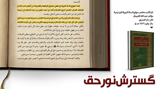 گسترش نور حق انتشار: ۱۴ آذر, ۱۳۹۵ بدون دیدگاه اشتراک گذاری «عبدالله بن غنیمان» در مقدمه ای که بر کتاب «مختصر منهاج السنه» نگاشته ، می نویسد:«جوانان اسلام امروز به خواندن این کتاب و شناخت محتوای آن احتياج دارند، چرا که رفض (تشیع) در همه مناطق اسلامی و غیر اسلامی به شكل بدی نفوذ کرده است».برگرفته از کتاب مختصر منهاج السنة النبویة ص 7دسته: گرافیک, نکاتی از کتاب شریف الغدیر قبلیقبلیقبله حاجات بعدیفائده ی زیارت قبور برای دنیابعدی