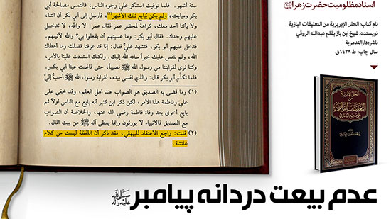 «بن باز» مفتی اعظم وهابیان که راهی برای توجیه عدم بیعت صدیقه طاهره سلام الله علیها با خلیفه نیافته ، گفته است: عبارت بیعت نکردن فاطمه، جزء روایت اصلی نبوده و بعداً به روایت صحیح بخاری اضافه شده است؟!