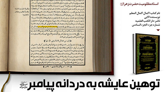«آبی» عالم بزرگ مغرب در«اکمال الاکمال» شرح صحیح مسلم آورده است: پس از آن که اسماء مانع ورود عایشه بر پیکر حضرت زهرای مرضیه سلام الله علیها شد، عایشه ضمن توهین به دردانه پیامبر صلی الله علیه و آله و سلم چنین گفت: