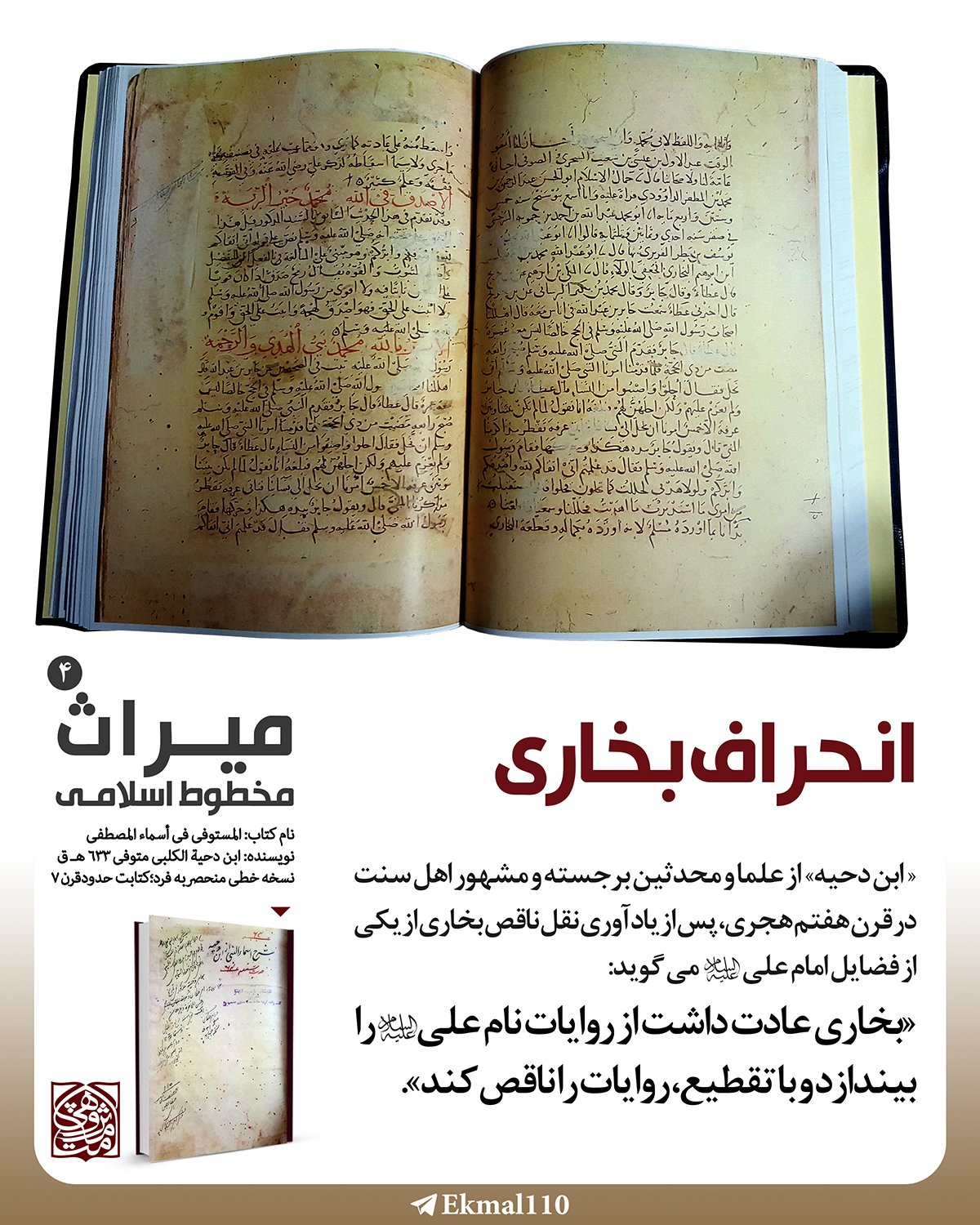 انحراف بخاری انتشار: ۲۱ فروردین, ۱۳۹۶ بدون دیدگاه اشتراک گذاری «ابن دحیه» از علما و محدثین برجسته و مشهور اهل سنت در قرن هفتم هجری، پس از یادآوری نقل ناقص بخاری از یکی از فضایل امام علی علیه السلام می گوید:«بخاری عادت داشت از روایات نام علی علیه السلام را بیندازد و با تقطیع، روایات را ناقص کند».برگرفته از کتاب «المستوفی فی أسماء المصطفی»دسته: دست نوشته ها, فیش های تصویری, میراث مخطوط اسلامی قبلیقبلیادب زمخشری نسبت به صدیقه طاهره سلام الله علیها بعدیآتش به خانه وحیبعدی