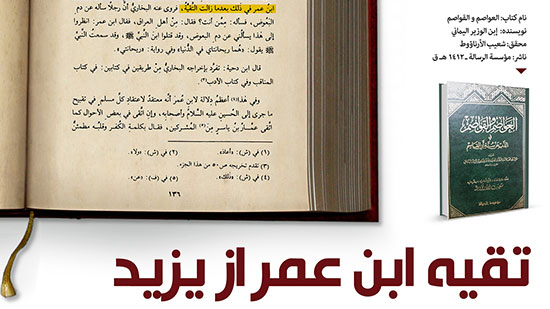 تقیه ابن عمر از یزید انتشار: ۴ اردیبهشت, ۱۳۹۶ بدون دیدگاه اشتراک گذاری «ابن وزیر یمانی» می گوید:«عبدالله بن عمر» پس از آنکه یزید برای بیعت گرفتن از مردم، از آنها اقرار بندگی می گرفت، از او تقیه نمود و اعتراض نکرد.برگرفته از کتاب «العواصم و القواصم» جزء 8 ص 136دسته: دست نوشته ها, فیش های تصویری قبلیقبلیتعصب بی جا بعدیمجازات برای دشنام ندادنبعدی