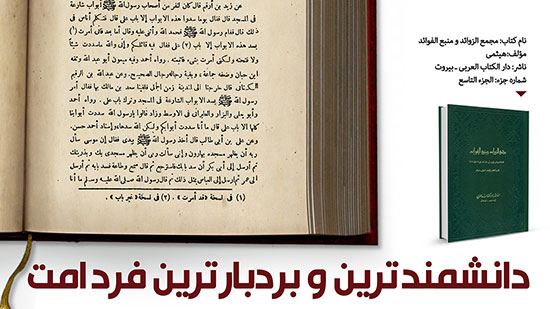 دانشمند ترین و بردبارترین فرد امت انتشار: ۱۱ مرداد, ۱۳۹۶ بدون دیدگاه بازدید: 4 اشتراک گذاری رسول خدا صلی الله علیه و آله و سلم به حضرت زهرا سلام الله علیها فرمود:«خشنود باش که علم و دانش همسر تو از همه امتم بیشتر و حلم و بردباری او از همگان عظیم تر است».پ ن: محقق کتاب سند روایت را معتبرمی داند.برگرفته از کتاب «مجمع الزوائد» جزء 9 ص 114دسته: دست نوشته ها, فیش های تصویری, نکاتی از کتاب شریف الغدیر قبلیقبلیوصی رسول و پناه امت بعدیدیدگاه وهابیت درباره توسل به پیامبر صلی الله علیه و آله و سلمبعدی