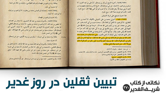 «زید بن ارقم» می گوید در سفری همراه رسول خدا صلی الله علیه و آله و سلم بودیم، وقتی به محل«غدیـر خـم» رسیدیم ایشـان در روزی که گرم تر از آن ندیده ام دستور توقف داد. سپس فرمود: همانا در نزد شما چیزی را به یادگار می گذارم که بعد از آن هرگز گمراه نشوید! «کتاب خدا» را؛ سپس دست علـی علیه السلام را گرفت و فرمود: ای مردم چه کسـی بر شمـا سزاوارتراست؟ گفتند: خدا و رسولش می دانند.آنگاه فرمود: «هر کس من مولای اویم، علی مولای اوست!»