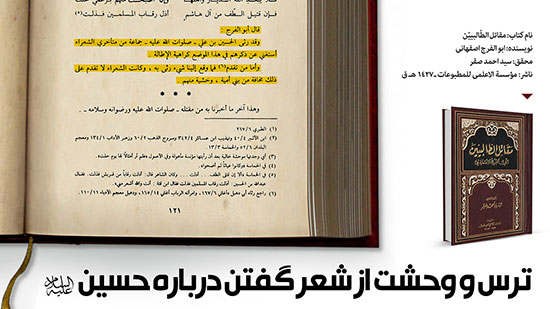 ترس و وحشت از شعر گفتن درباره حسین علیه السلام انتشار: ۶ مهر, ۱۳۹۶ بدون دیدگاه بازدید: 15 اشتراک گذاری «ابوالفرج اصفهاني » :امروزه برخی از شعرای متاخر در رثای حسین بن علی علیه السلام شعر می سرایند، اما در گذشته از ترس دولت بنی امیه کسی جرات نمی کرد برای حسین علیه السلام مرثیه بگوید.برگرفته از کتاب «مقاتل الطالبیین» ص 121دسته: دست نوشته ها, فیش های تصویری, نکاتی از کتاب شریف الغدیر قبلیقبلیممنوعیت سرودن شعر در رثای سیدالشهدا علیه السلام بعدیحمله وهابیت به کربلابعدی