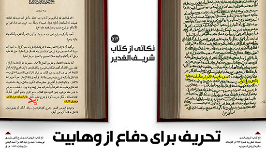 «من به سید الاحباب(رسول خدا صلی الله علیه و آله و سلم) متوسل می شوم و به واسطه ی او از خداوند بهترین پاداش ها را طلب می کنم»؛ این در حالی است که در نسخه چاپی همین کتاب، عبارت توسل به رسول خدا صلی الله علیه و آله و سلم حذف شده است تا بدین وسیله از عقیده باطل وهابیت دفاع گردد!!