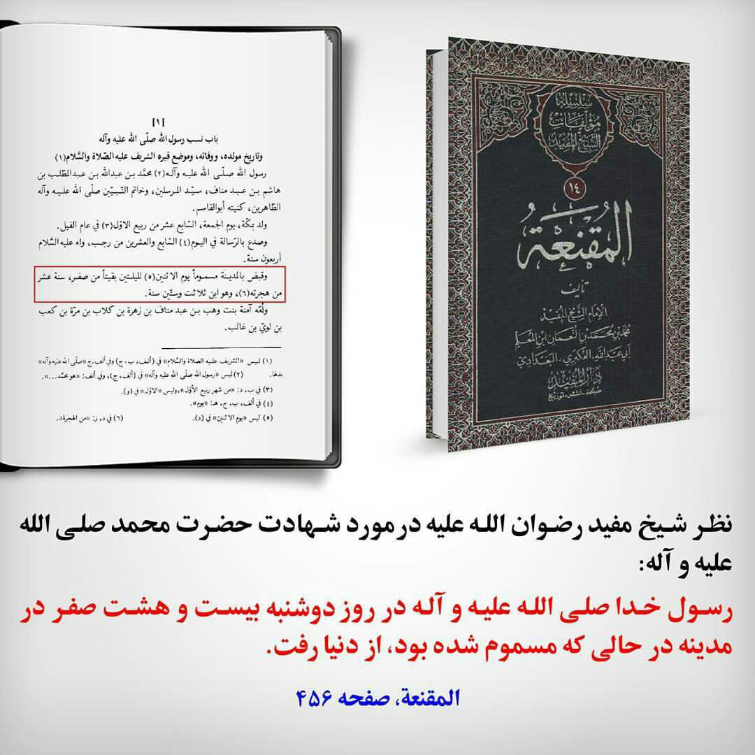 در میان قدمای اهل سنت معروف است که قائل اند رسول خدا در روز دوشنبه در مدینه با سم به شهادت رسیده است . شیعیان هم همین طور .