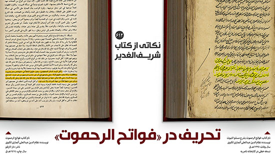 «مولوی عبدالعلی لکنوی» عالم برجسته حنفی در نسخ خطی «فواتح الرحموت»، حضرت زهرا سلام الله علیها را به دلیل خشم و غضب بر خلیفه اول به ارتکاب ذنب و گناه متهم می کند؛ این در حالی است که در نسخه چاپی این اثر در سال 1414هـ ق توسط انتشارات دارارقم، با حذف واژه «ذنب» و تغییر آن به «فی امرٍ غیر مناسب لمرتبتهم» و اضافه کردن عبارت «لا ذنب فیه»، کوشیده شده است از بار منفی این جسارت کاسته شود.